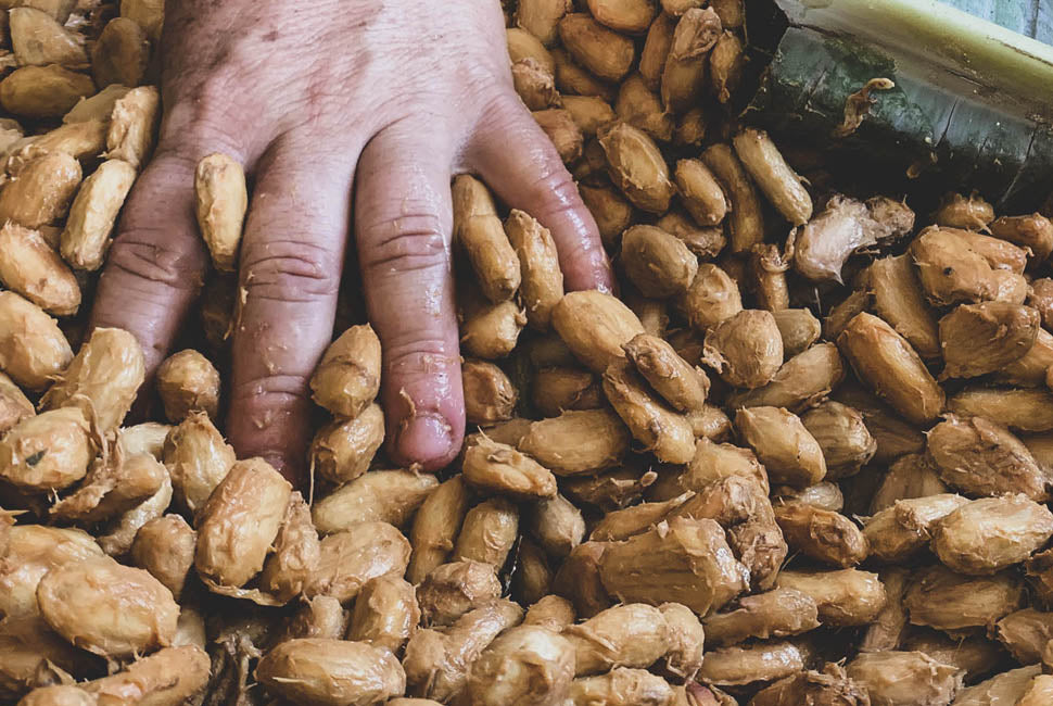 Para fermentar el cacao, los granos húmedos se colocan en montones grandes dentro de finas cajas de madera de laurel y cubiertas por cáscaras de plátano. La pulpa dulce y sus azúcares crean un ambiente en el que puede ocurrir la fermentación.